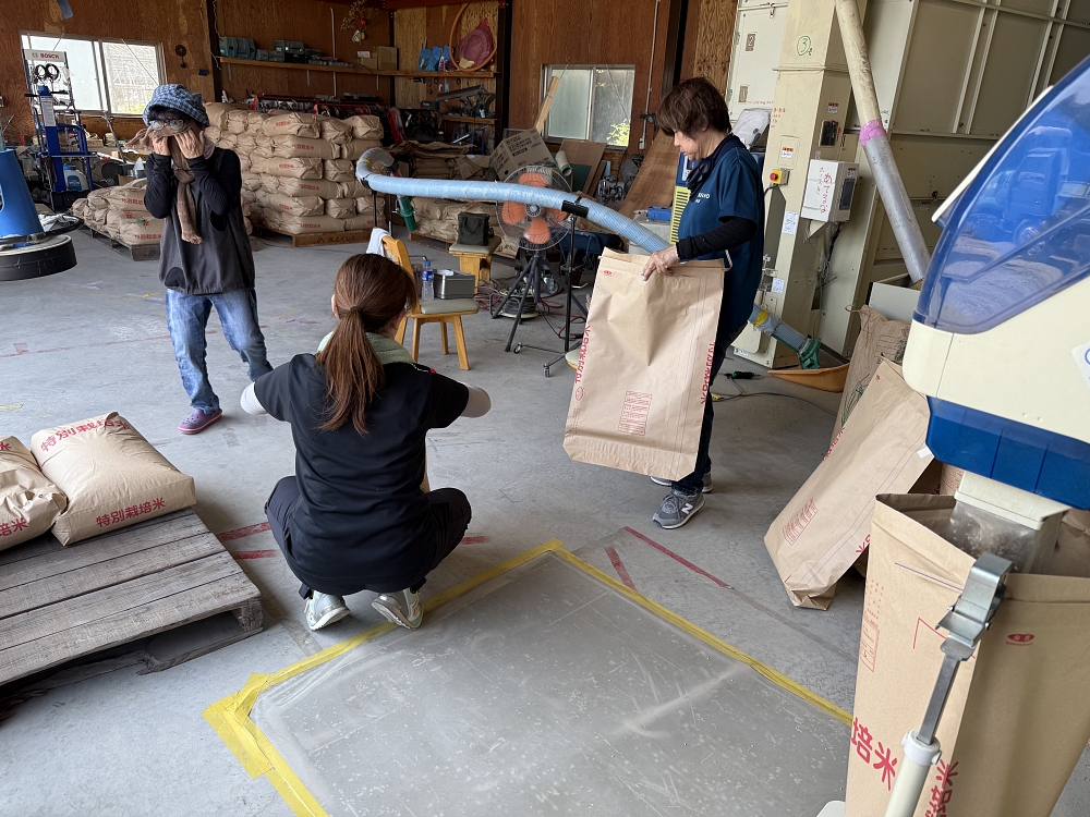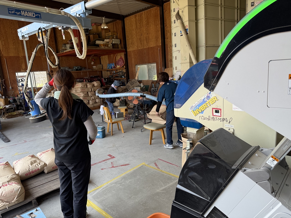籾摺りを農業女子が暑い中頑張って仕事しています