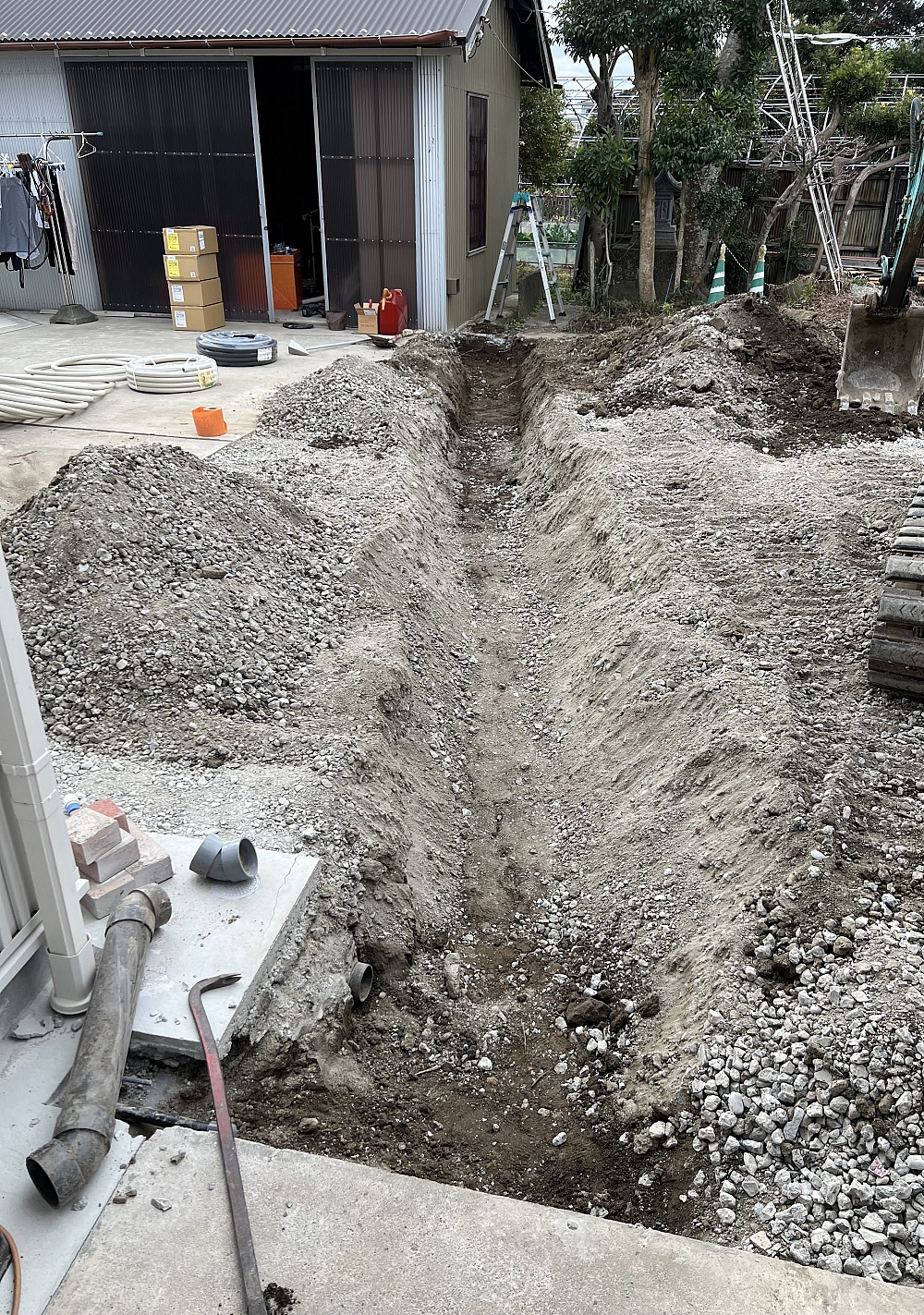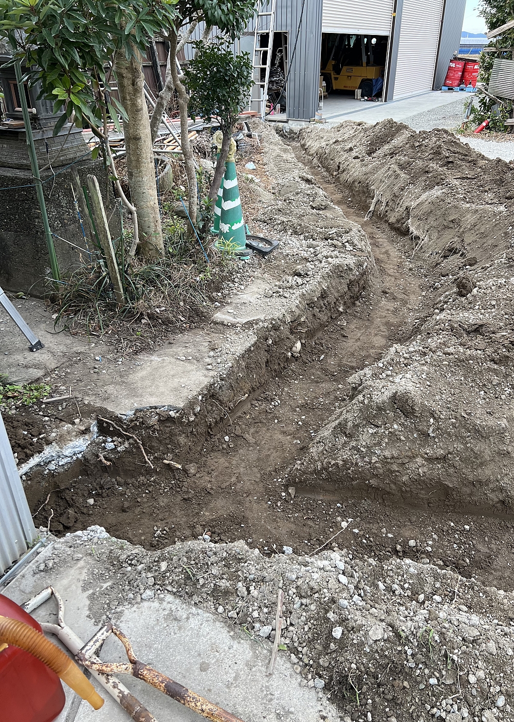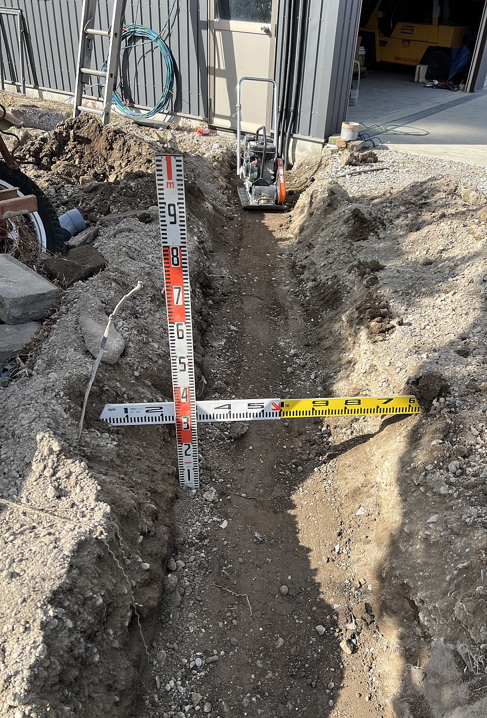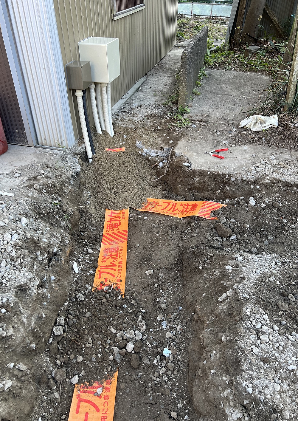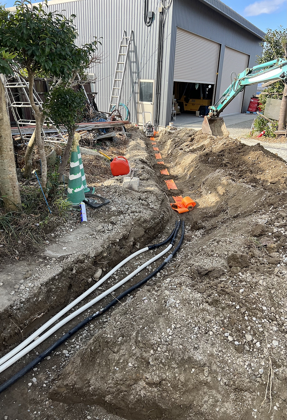 解体終了後に電気埋設管を埋設し、電線を通して埋め戻し完了。
