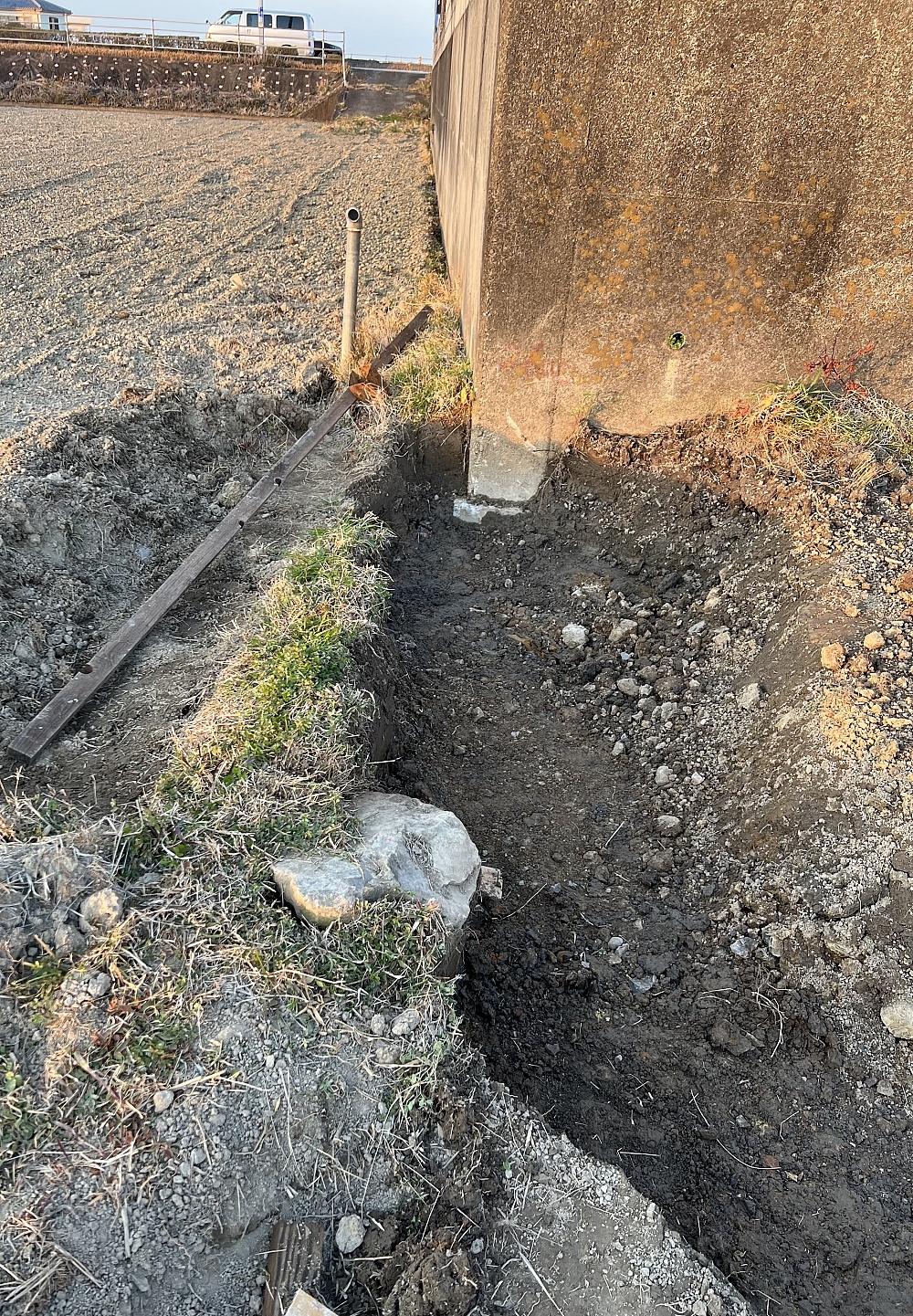 今日は隣との境界壁の掘り方の手伝い