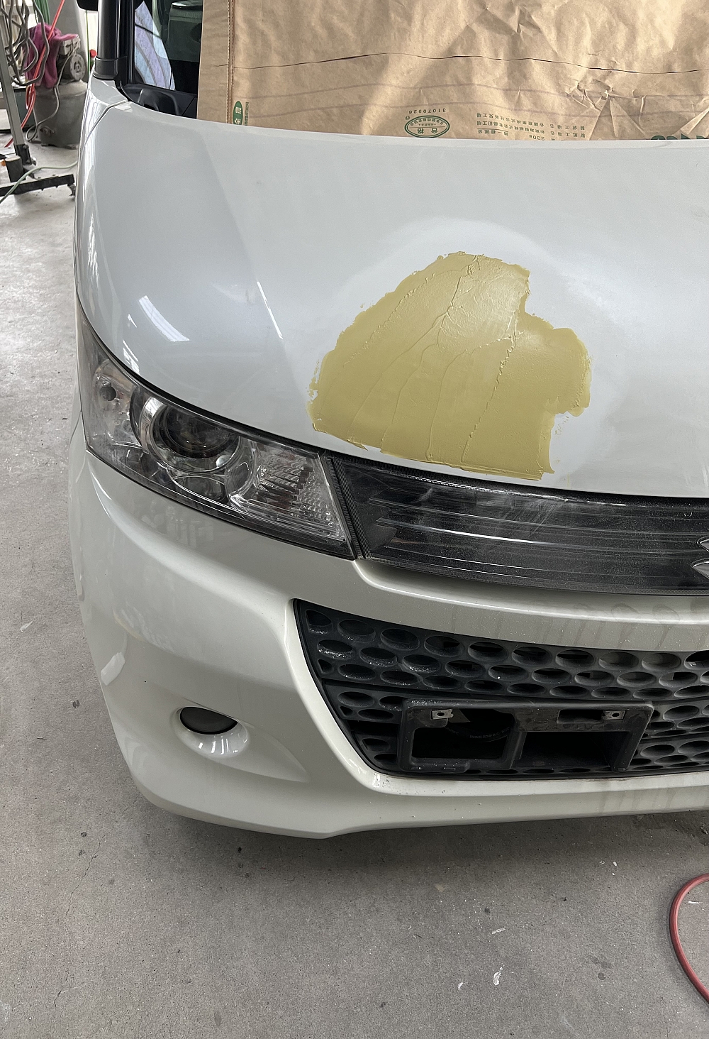左側のリヤドアとボンネットの鈑金塗装