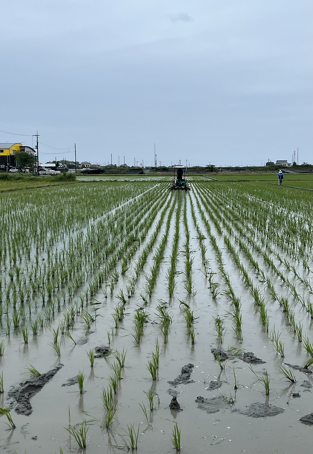 私は草刈り機で周りを刈っています、奥さんはタニシの卵取り!