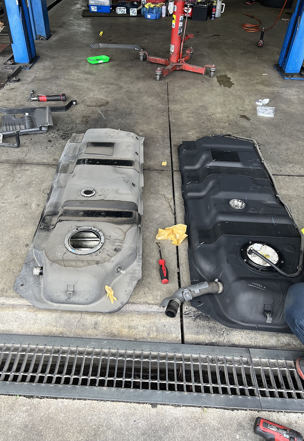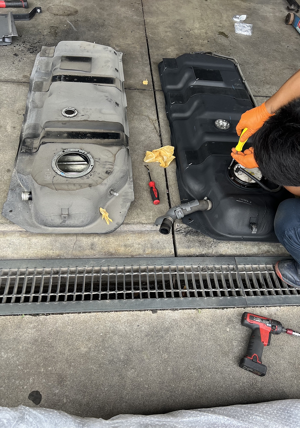 燃料タンクが凹んでいるが、ガソリンは漏れてないけど交換します。